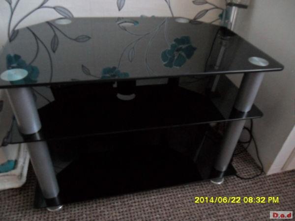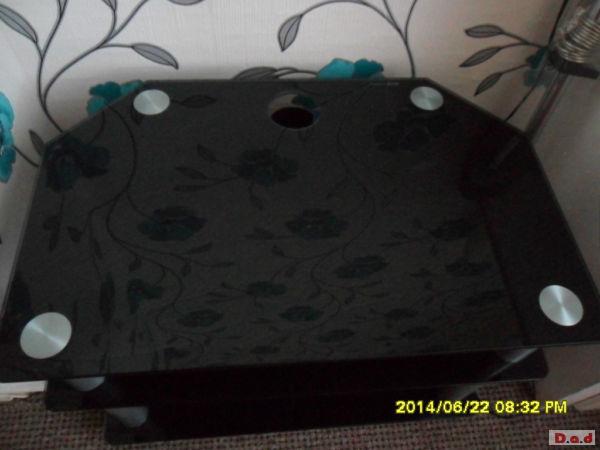 Glass t.v. unit black and silver has two shelves underneath for dvd player freeview box etc and has a built in cable tidy at the back exact measurements can be given upon request